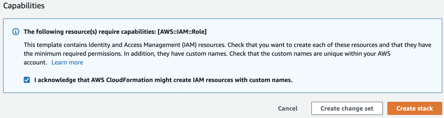 3. To launch the stack mark the checkbox at the bottom confirming CloudFormation will create IAM resources, and click Create stack.